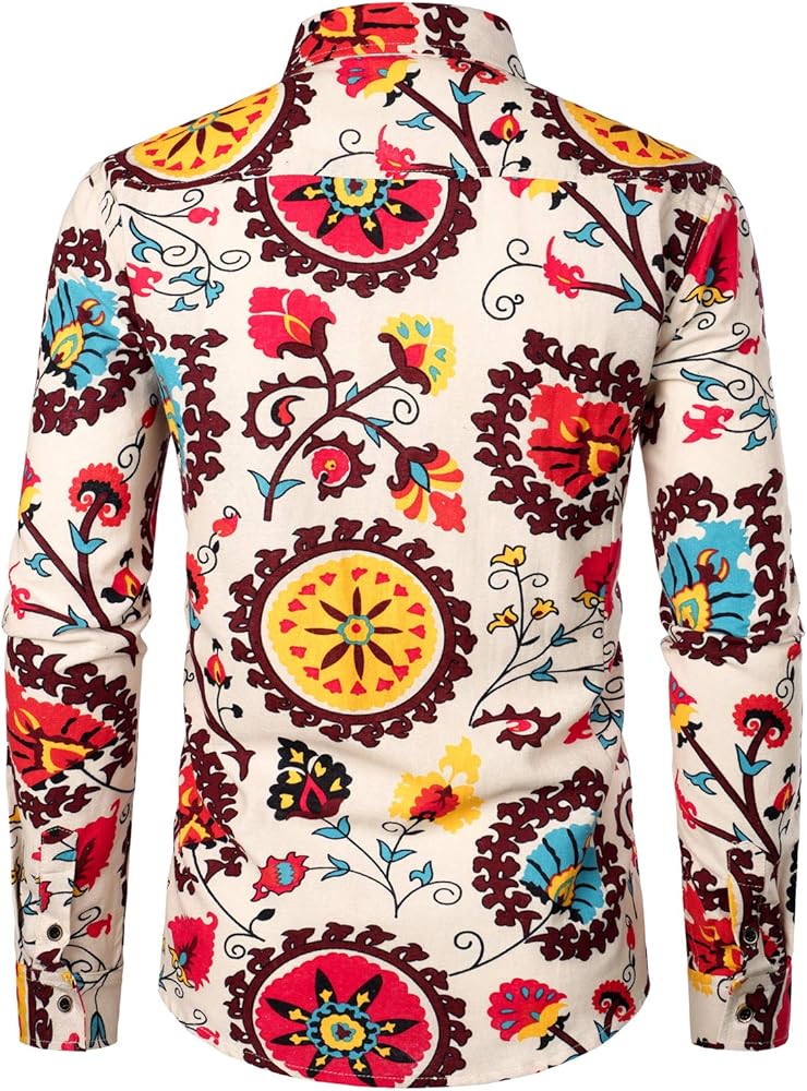 Lucmatton Men S Linen 70s Hippie Traditional Style Pattern Printed Long Sleeve Button Up Shirt Beige Yellow Small At Amazon Men S Clothing Store